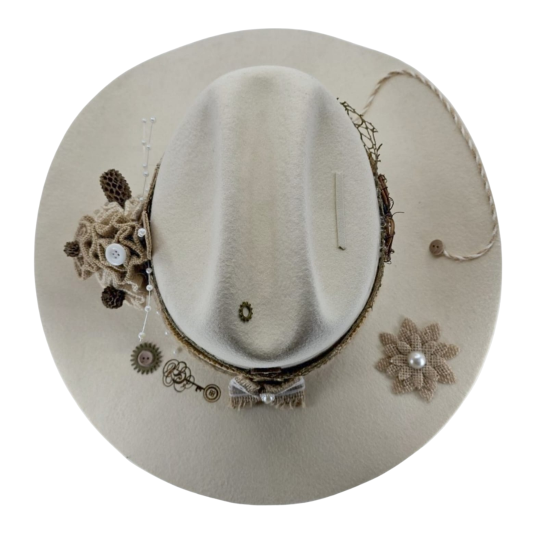 Awe Natural celebrates the beauty of the natural world with earthy tones and rustic details. This cream cowboy brim is decorated with burlap flowers, delicate lace, and charming buttons, creating a vintage-inspired aesthetic. Gear and key accents add a whimsical steampunk flair, while natural textures tie it all together. Perfect for nature lovers, this brim is a tribute to the serene outdoors.
