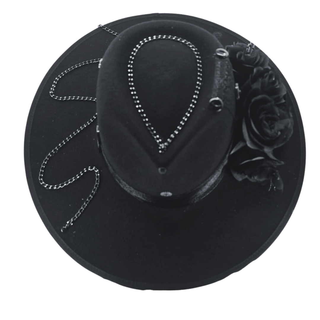 Nyah embodies elegance and sophistication, perfect for the modern romantic. This striking black brim features intricate beading arranged in a teardrop design and is adorned with black roses for a touch of timeless charm. Chain accents add an element of edge, making it an ideal statement piece for weddings and other special occasions. Nyah is where bold meets beautiful.