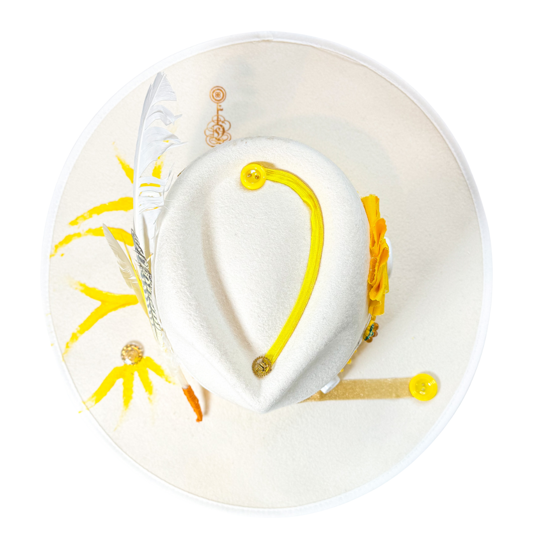 Crème Australian Wool Fedora with Yellow ribbon with Cog and button embellishments on its ends inside the teardrop of the crown. Pleated yellow fabric on the right side of the crown. The base of the crown is wrapped in vanilla color netting under a vertical crisscross leather chord band. Fedora Crown band embellished with metal cogs, buttons, feathers, victorian key, and jeweled pineapple. Fedora’s brim was decorated with paint strokes, gold jewelry, and gold ribbon stretched across the right side with a button on end.
